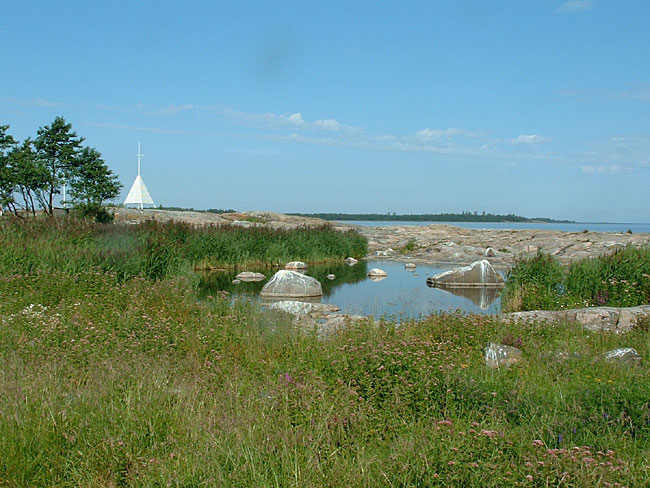 Det välkända sjömärket som syns vida omkring. Fotograferat mot norr med Mangrund och Själgrund i bakgrunden.